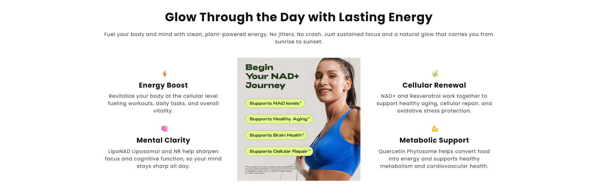 A clinically-backed cellular support formula powered by NAD+ boosters and antioxidant-rich botanicals crafted to fuel your energy, focus, and longevity from within.